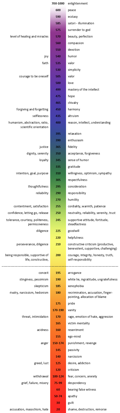 Ova doljnja logaritamska skala svijesti, koju je sastavio tim znanstvenika kineziologa, predvođen liječnikom i psihijatrom Sir David R. Hawkinsom pokazuje logaritamske vrijednosti pojedinih modaliteta svijesti i ukazuje na to koji modusi svijesti imaju konstruktivniju moć u kontekstu polja privlačenja. Što je modalitet svijesti viši prema toj logaritamskoj skali od 1-1000, to je jače njegovo privlačno polje i moć privlačenja i manifestiranja pozitivnih životnih uvjeta. Konstruktivni modaliteti svijesti imaju konstruktivnu moć, a oni destruktivni imaju destruktivnu moć. Prema tome, kada je tvoja svijest na visokoj razini zahvalnosti, bezuvjetne ljubavi, radosti ili mira, onda možeš privući na sebe uvjete za blagostanje, za razliku od stupnjeva svijesti kao što su strah, brige, ljutnja i slične kojima privlačiš ekvivalentne, negativne uvjete.